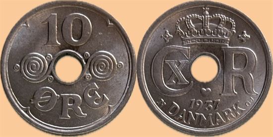 10 øre 1937 i kv. (0) - lidt svagt præget R