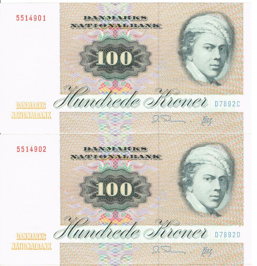 Seddel: 100 kr. 1989 D7892 i kv. 0 2 stk. fortløbende nr.