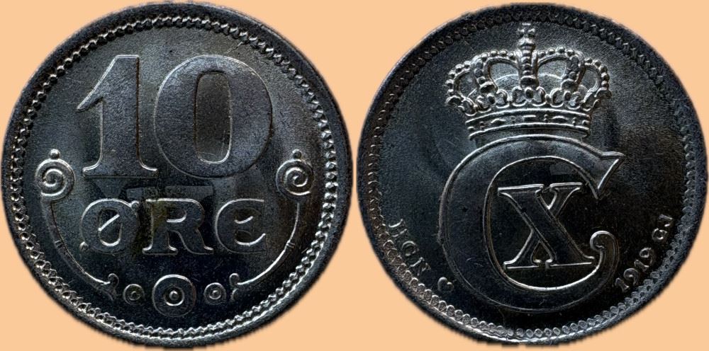 10 øre 1919 i kv. 0 - flot, præget med nye stempler