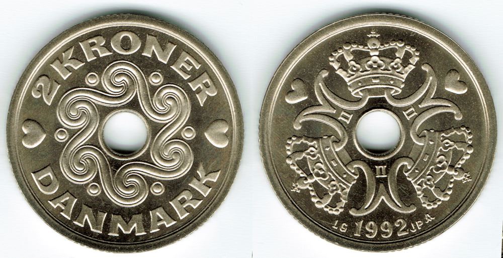 2 kr. 1992 i kv. S - fra Kgl. møntsæt